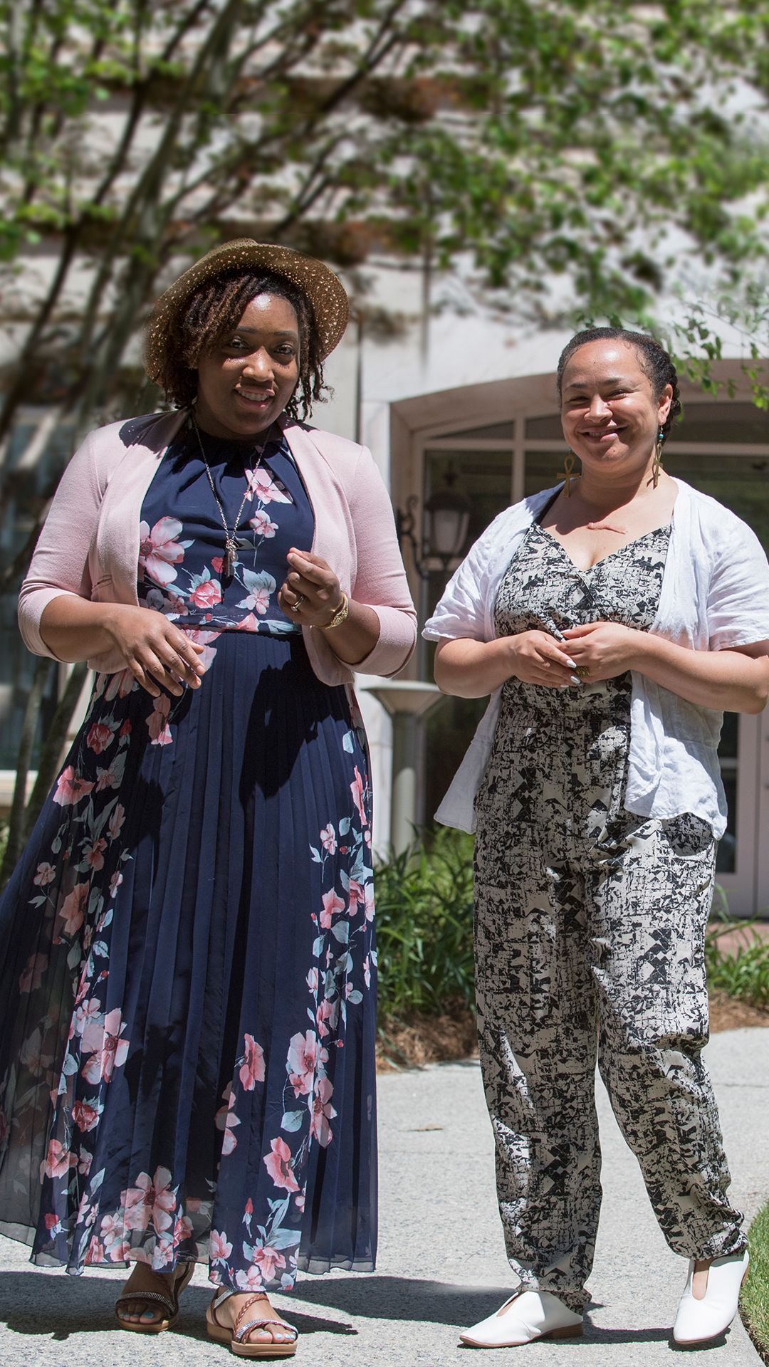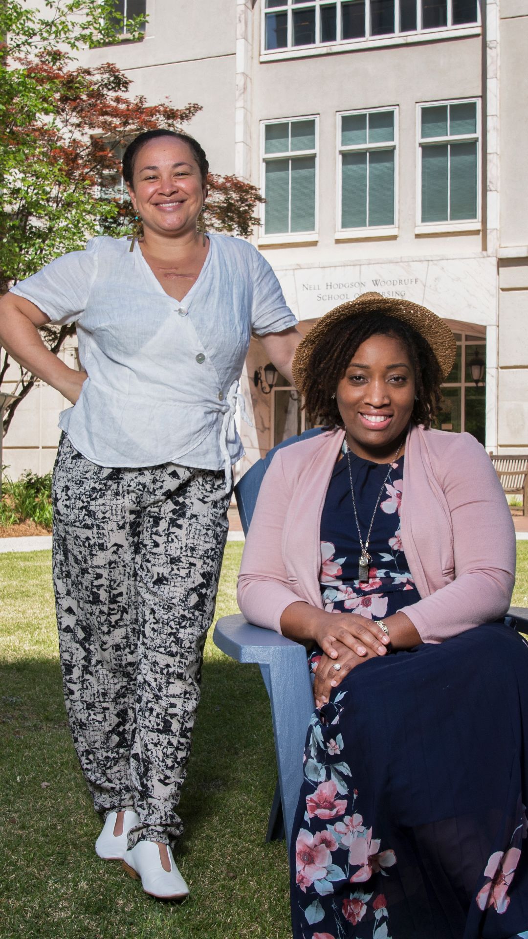 Researcher Alexis Dunn-Amore (left) with her mentee, Katiana Carey-Simms, on the grounds of Emory’s nursing school
