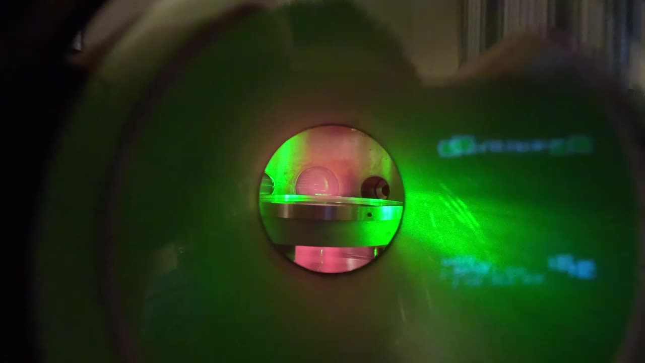 A view inside the laboratory vacuum chamber, where collodial particles are suspended in a flat disc, lit by the green light of a laser, to study dusty plasma. (Burton lab)